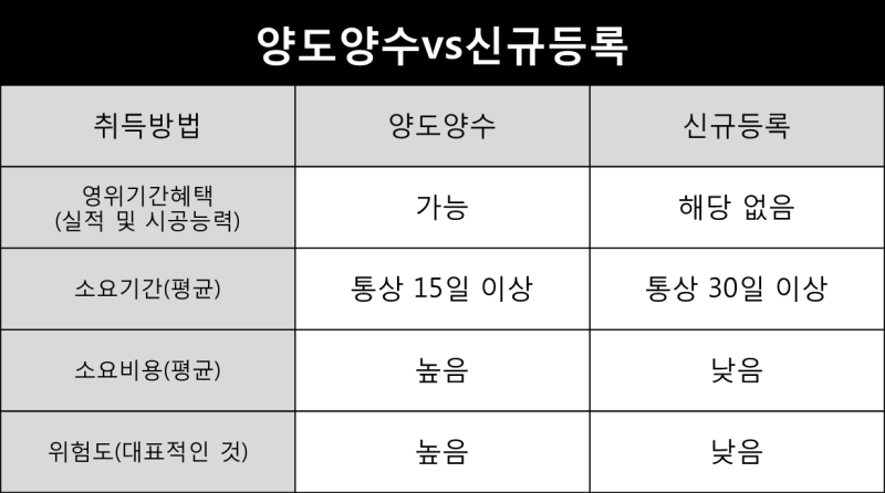 양도·양수도는 건축공사업 면허를 등록한 회사 자체를 인수하는 방식이다. 허가증을 사고 파는 개념의 건설업 거래입니다. 따라서 재등록할 수 있는 시간은 없으며, 입찰참가 또는 건설사업 도급을 목적으로 하는 경우에는 공사 양도가 유효합니다.