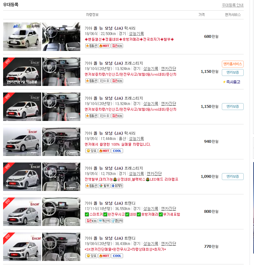 엔카의 기아 올뉴모닝 중고차(5만km 이하)의 시세는 약 700만~1000만 원대이며, 엔카 보증 판매가는 약 1000만 원 정도로 추정된다. 항목 수는 약 480개입니다.