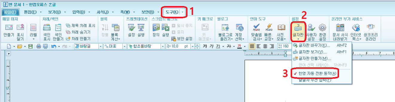 (도구) – (텍스트 상자) – (한영 자동 변환 처리)가 비활성화됩니다.