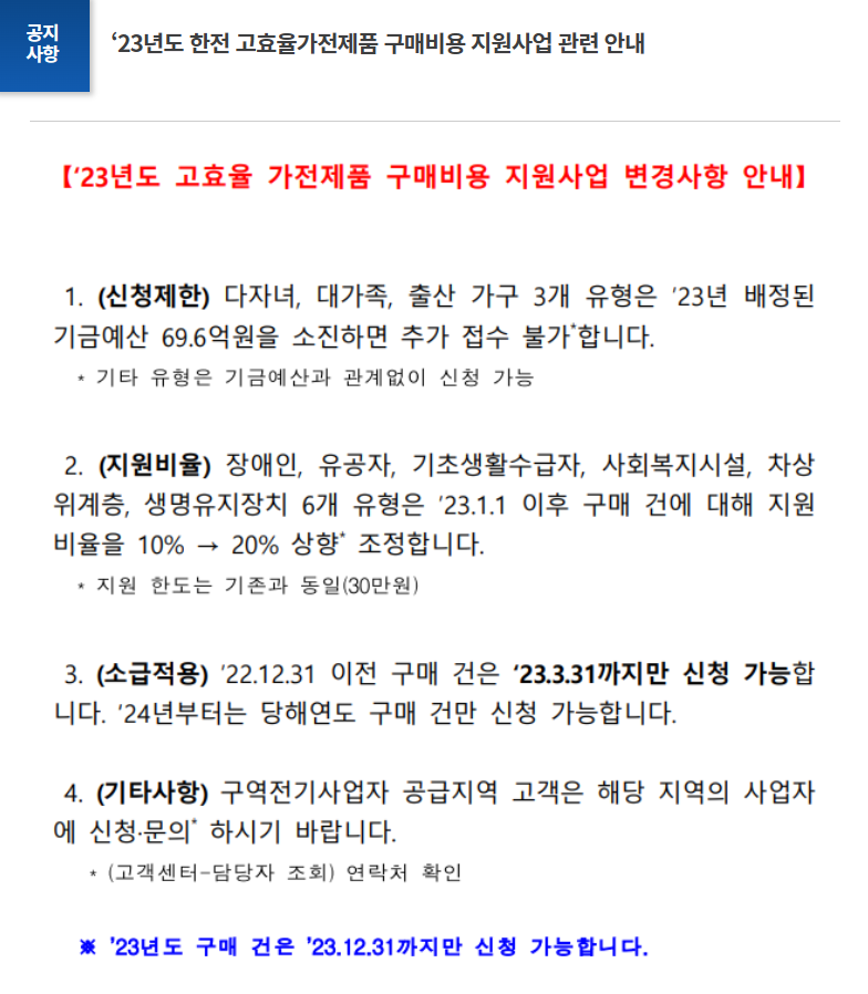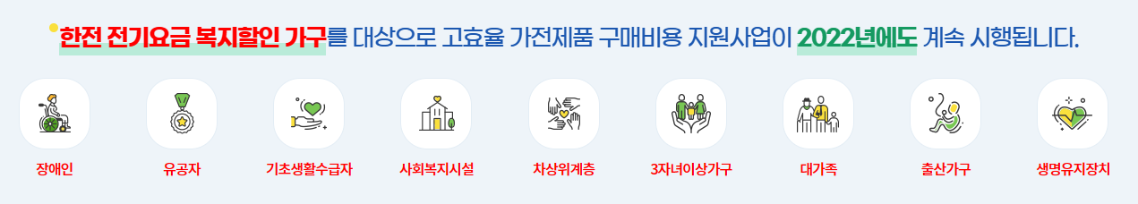 한전에서 전기요금 할인으로 가구의 에너지 공급 확대를 위해 고효율 가전제품 구입 초기비용의 10%(가구당 최대 30만원)를 지원하는 사업이다. 2021년 4월 23일 이후에 구매한 제품은 지원 대상이 되며 그 이전에 구매한 제품은 지원 대상이 아닙니다.