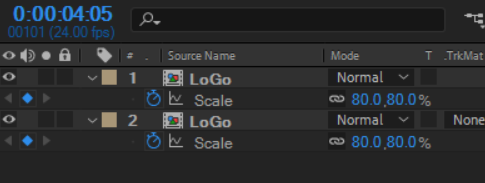 05. Layer 1의 “Logo”에 Opacity를 적용하여 0에서 100%로 값이 변경되어 나타나는 장면을 만듭니다.