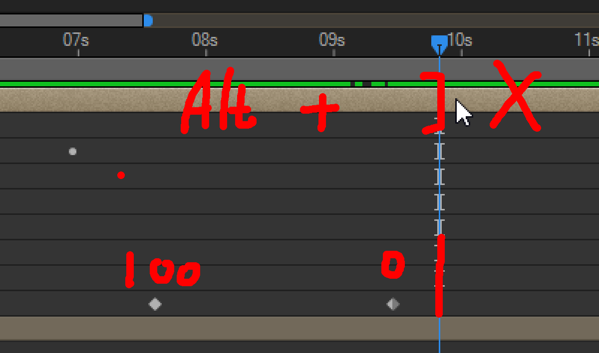 Premiere Pro에서와 같이 현재 레이어의 뒷부분이 필요하지 않은 경우 자르기 옵션이 있습니다. 닫는 괄호를 Out, 즉 끝이라고 생각하고 Alt 키를 누른 상태에서 닫는 괄호를 누르면 아래 이미지와 같이 뒷부분이 잘립니다. 앞부분은 대부분 밀듯이 밀어서 움직일 수 있어서 자를 필요는 없지만 큰 클램프를 열면 앞부분이 잘립니다.
